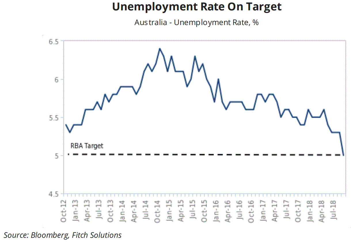 Unemployment has fallen to 5.0% in September, the level which the RBA has been targeting based on its monetary policy statements. Real GDP growth also picked up to 3.4% y-o-y in Q218, from 3.2% y-o-y in Q118 and we forecast growth to average 3.0% for 2018, close to RBA’s target ‘a bit above 3%’ for the year. Although we forecast growth to slow to 2.5% in 2019 alongside global growth, we wish to highlight that risks to our forecast are weighted to the upside. Should growth firm and surprise to the upside around 3.0% in 2019, this would provide more reason for the RBA to raise interest rates. In particular, we believe that inflation could pick up faster in 2019 and we forecast inflation to print at 2.4% in 2019, up from 2.1% in 2018, due to higher oil prices over the coming quarters.