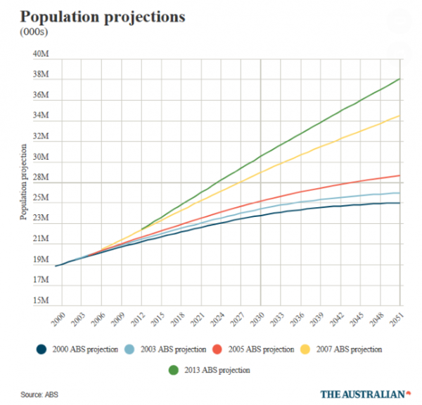 It is time to reflect: twenty years ago, in 1998, the Australian Bureau of Statistics (ABS) forecast that Australia’s population would hit between 23.5 and 26.4 million by year 2051. At the time, the ABS incorrectly assumed fertility rates would decline and, most importantly, that net overseas migration (NOM) would remain at 90,000 rather than the 240,000 currently.