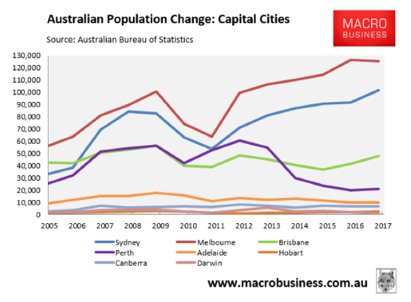 Australians living in two major cities have also been forced to live in smaller and more expensive housing, as the population deluge has not only lifted demand, but also forced greater density (eg. High-rise apartment).