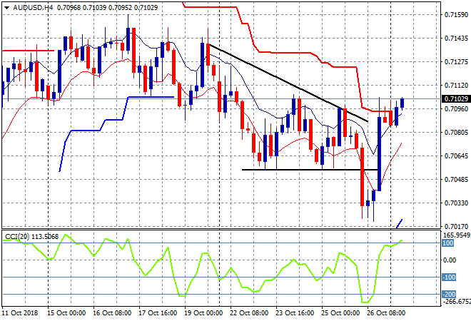 The ASX200 is doing much better, closing 1.1% higher to 5728 points after a terrible week previously, this was a bank led rally where stocks have been extremely oversold so bargain hunters are piling in. The Aussie dollar has continued its Friday night reversal, pipping just above the 71 handle and rolling ATR resistance on the four hourly chart: