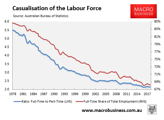 One of the most striking trends that has developed across the Australian economy over recent decades has been the sharp fall in the share of full-time employment, as illustrated by the following charts: