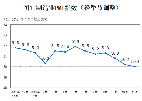 In November 2018 , the China Manufacturing Purchasing Managers Index ( PMI ) was 50.0% , a slight drop of 0.2 percentage points from the previous month , at a critical point.