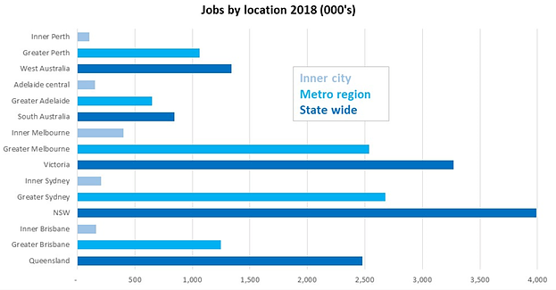 The graph below shows the spread of existing job numbers by state, major metro region and inner city. Some things stand out: