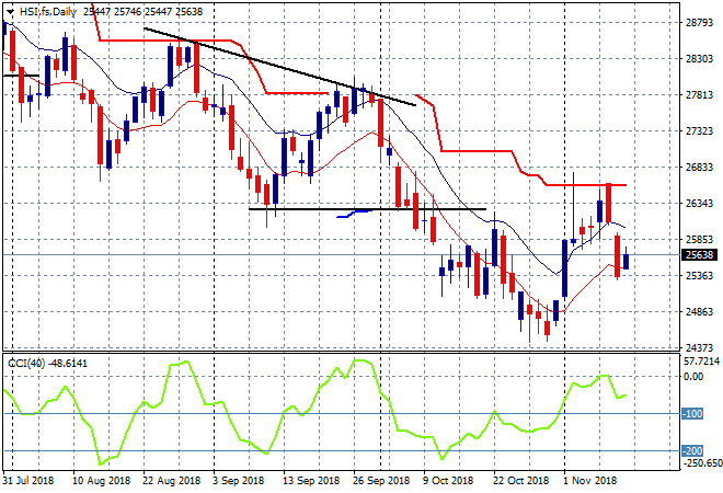 The Shanghai Composite looks set to close 1 or more % higher, currently at 2627 points, still hanging on to key support at the 2600 level as it has been unable to translate the recent swing gains into a proper recovery last week. The Hang Seng Index is meandering however, barely up 0.1% or so to 25644 points, with the daily chart showing how it’s been unable to get back to the previous support level at 26000 points: