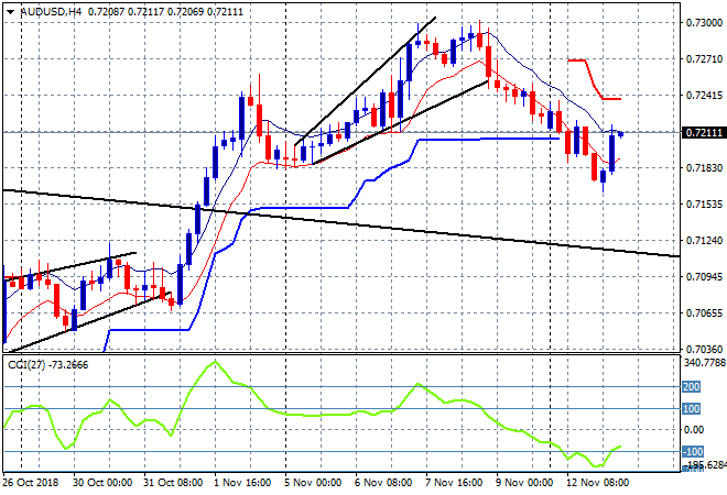 The ASX200 gave back all of its recent gains to finish 1.8% lower to finish the day at 5834 points, unable to hold on to support at the 5900 level. The Aussie dollar has found some buying support here with a small bounce to get just above the 72 handle . Note however on the four hourly chart that the high moving average remains untouched with momentum still quite negative – this looks like short covering at best:
