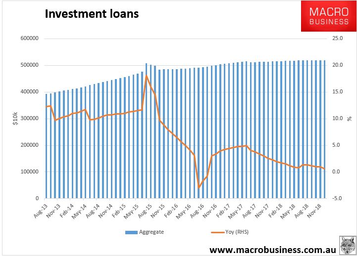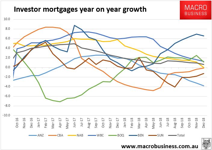 APRA released December mortgage lending this morning and the investor retreat continues apace. Growth at top eight banks has now stalled out completely, rising just 0.6% year on year: