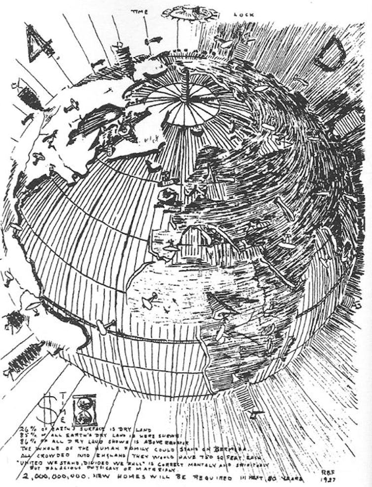 This dream was championed most influentially in the 20th century by US scientist Richard Buckminster Fuller, with his evolving concepts for an Air-Ocean World Town Plan (1928), Dymaxion map (1943), Geoscope (a giant electronic space-frame globe, 1962) and his book, Operating Manual for Spaceship Earth (1969).