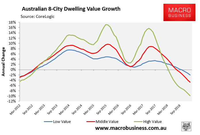 A strong theme of this housing bust has been the degree to which value falls have been driven by the top-end of the market. As shown in the next chart, the top 25% of capital city homes (“High Value”) fell 9.9% in the year to January 2019, versus falls of 4.8% across the middle 50% of properties (“Middle Value”), and 2.0% across the bottom 25% (“Low Value”):