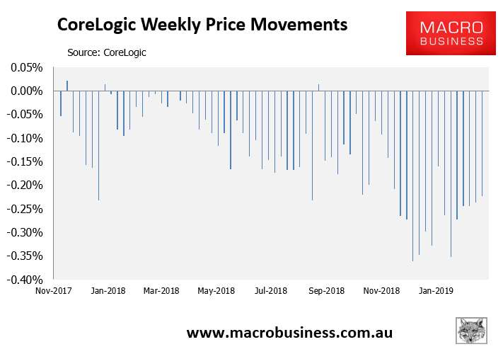 In the week ended 21 February 2019, the CoreLogic 5-city daily dwelling price index, which covers the five major capital city markets, tanked another 0.22%: