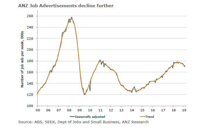 ANZ Australian Job Advertisements fell 0.9% m/m in February, down 4.3% over the year. This was the fourth monthly decline in a row. In trend terms, job ads fell by 0.7% m/m and 2.8% on a yearly basis.