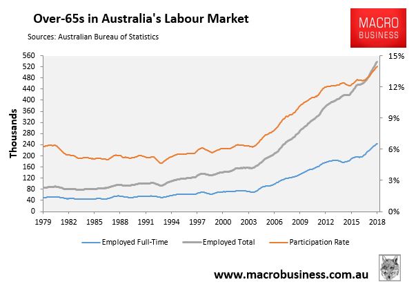 The below data plotting employment and labour force participation rates for 65 and over Australians tells the same story: