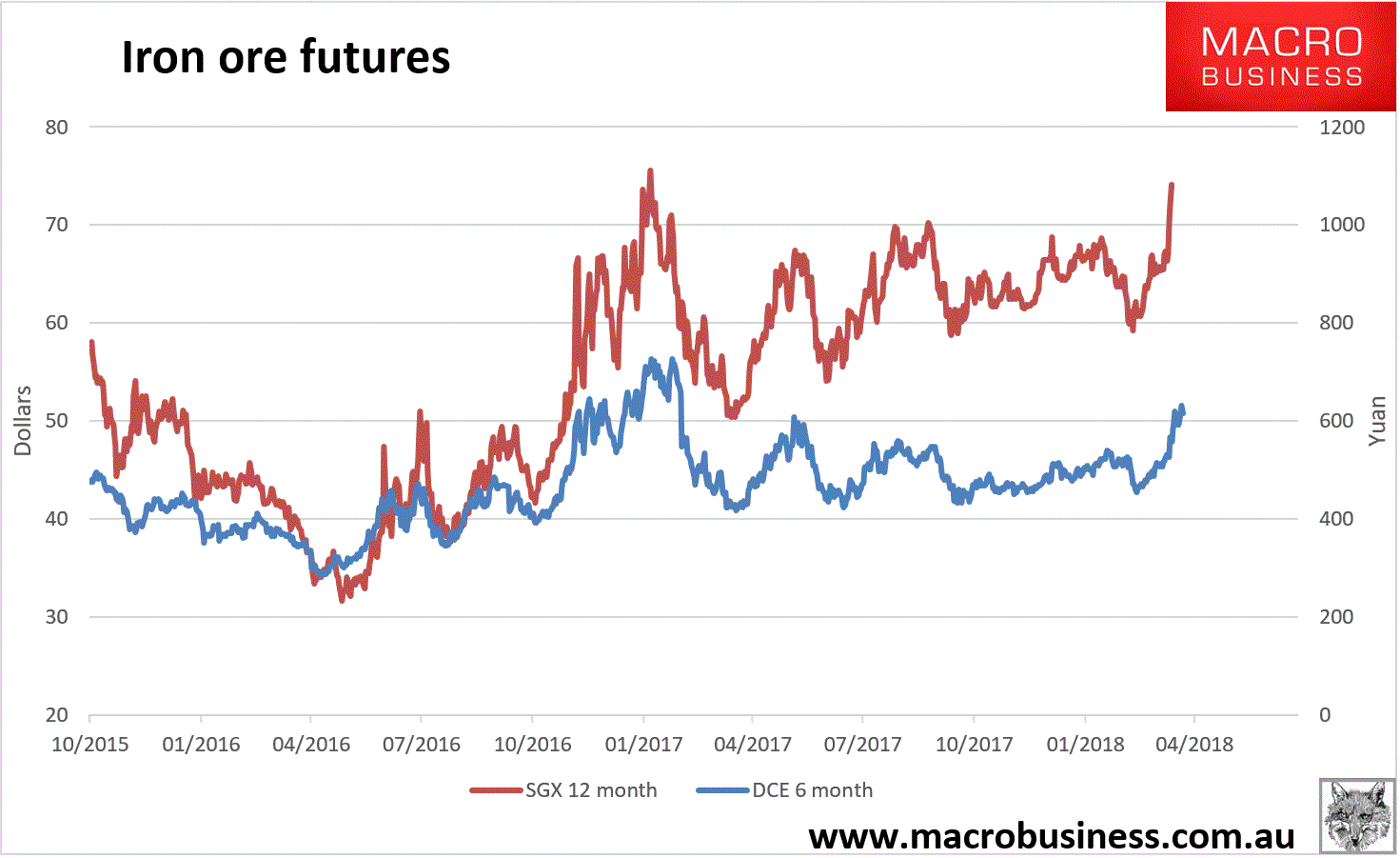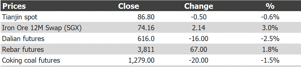 Spot down. Paper down more. Coking coal stable. Steel strong. We’re entering a seasonal period when iron ore would normally be falling but that has been badly compromised by the Vale accident and Chinese stimulus efforts such as they are. That has destocking mills battling with other extraneous forces for now. I think it likely that prices will remain firm until both are clarified.