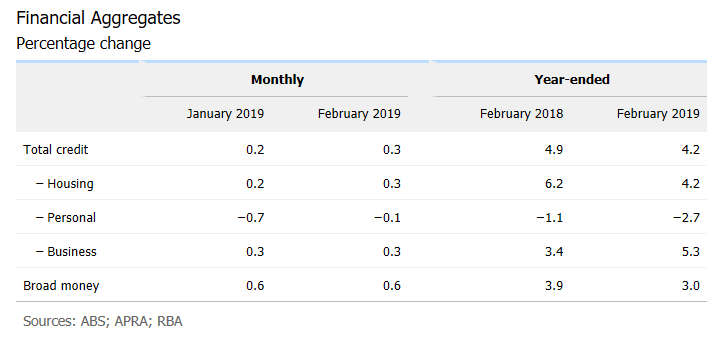 The Reserve Bank of Australia (RBA) has released its private sector credit aggregates data for the month of February 2019: