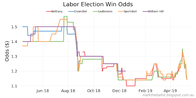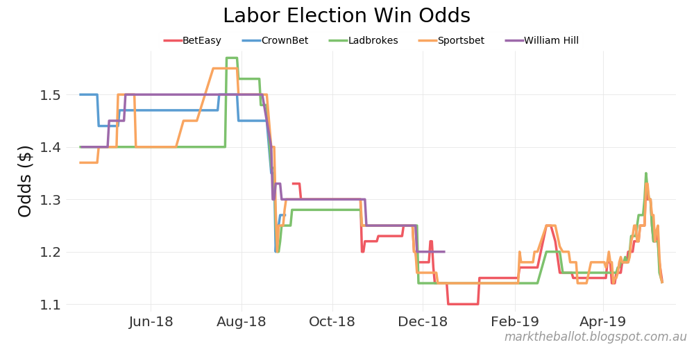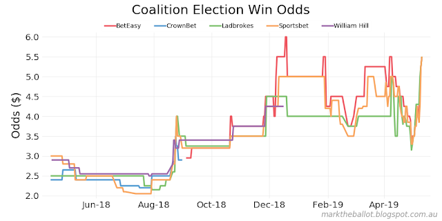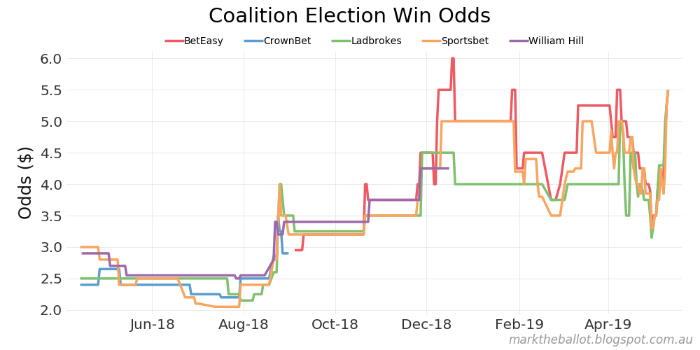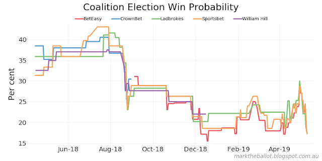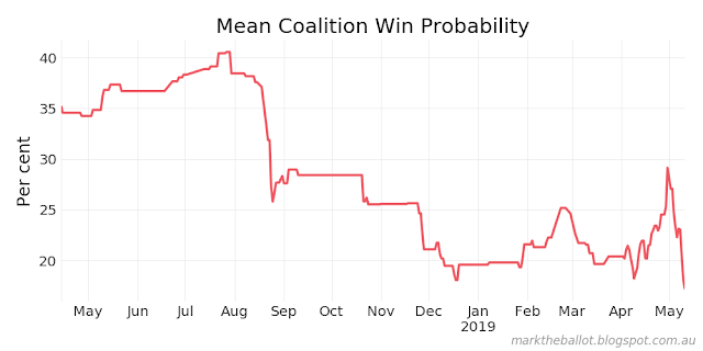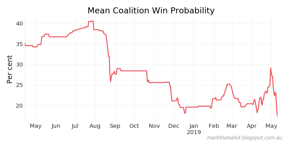 Date Mean Coalition Win Probability (%) 2019-04-11 19.30 2019-04-12 20.75 2019-04-13 21.65 2019-04-14 21.96 2019-04-15 21.96 2019-04-16 20.24 2019-04-17 20.19 2019-04-18 21.50 2019-04-19 21.53 2019-04-20 22.65 2019-04-21 23.01 2019-04-22 23.44 2019-04-23 23.44 2019-04-24 22.96 2019-04-25 23.30 2019-04-26 24.54 2019-04-27 24.54 2019-04-28 24.54 2019-04-29 25.29 2019-04-30 29.15 2019-05-01 28.13 2019-05-02 27.08 2019-05-03 27.08 2019-05-04 24.61 2019-05-05 23.30 2019-05-06 22.30 2019-05-07 23.14 2019-05-08 23.04 2019-05-09 20.20 2019-05-10 18.01 2019-05-11 17.17 This dramatic rise and fall since the campaign began on 11 April can be seen on the right hand side of the following charts.