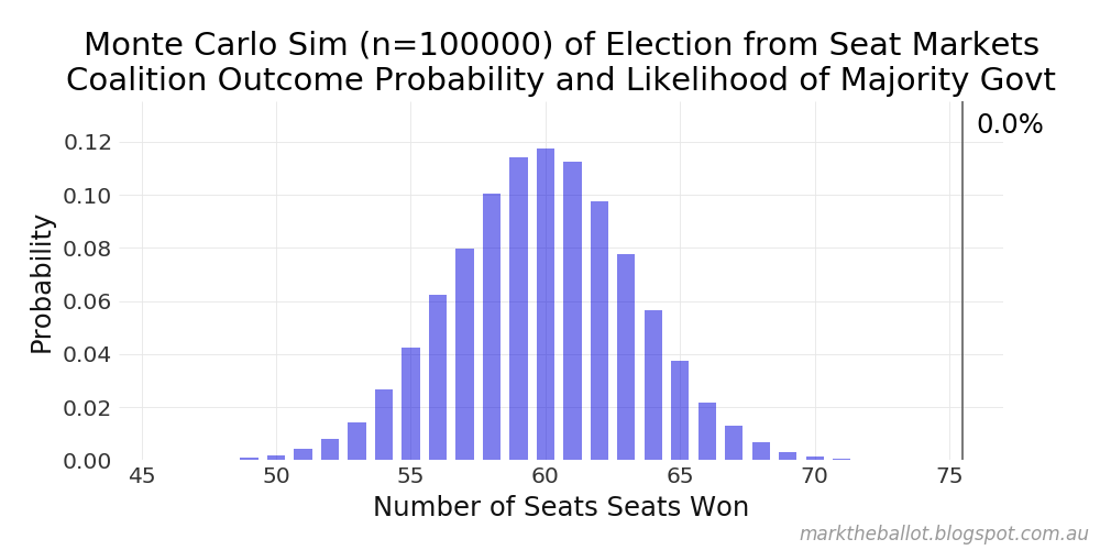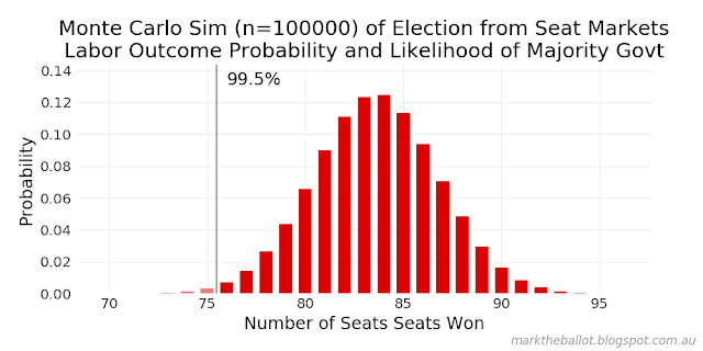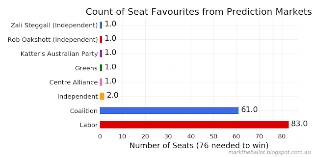 Turning to the individual seat markets at Sportsbet, the summary charts follow. Consistent with the above charts, the bookmakers see a sizable Labor majority as the most likely outcome.