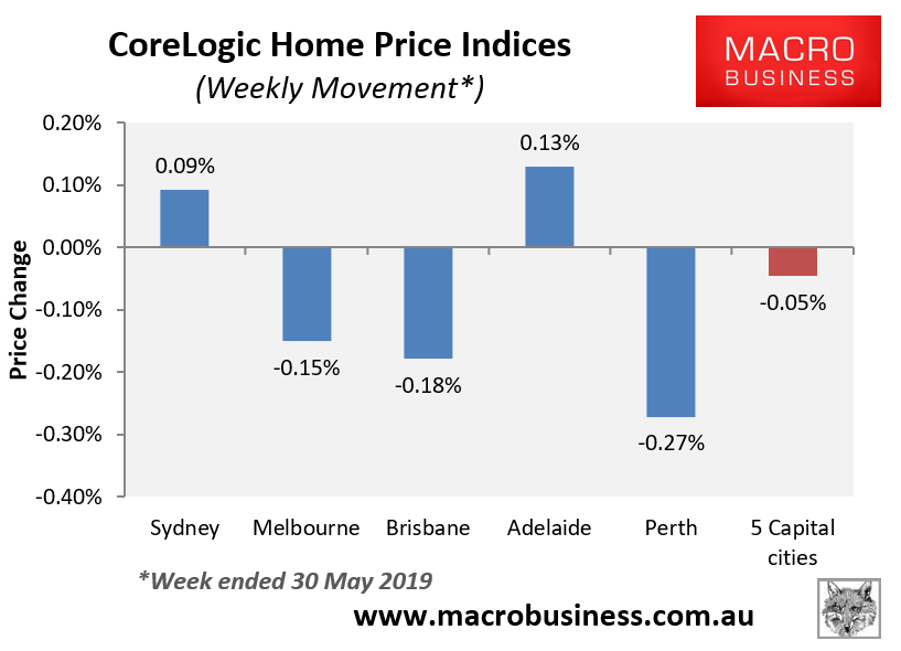 In the week ended 30 May 2019, the CoreLogic 5-city daily dwelling price index, which covers the five major capital city markets, fell by 0.05%: