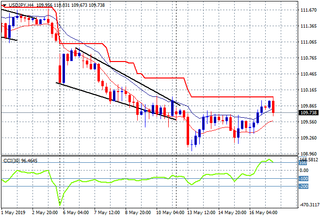Japanese share markets are the standout, with the Nikkei 225 up 1% to 21278 points despite a reversal in Yen weakness. The USDJPY pair has rejected overhead resistance at the 110 handle and fallen back below its own high moving average on the four hourly chart after a breakout to the upside in the last 24 hours – not a good signal: