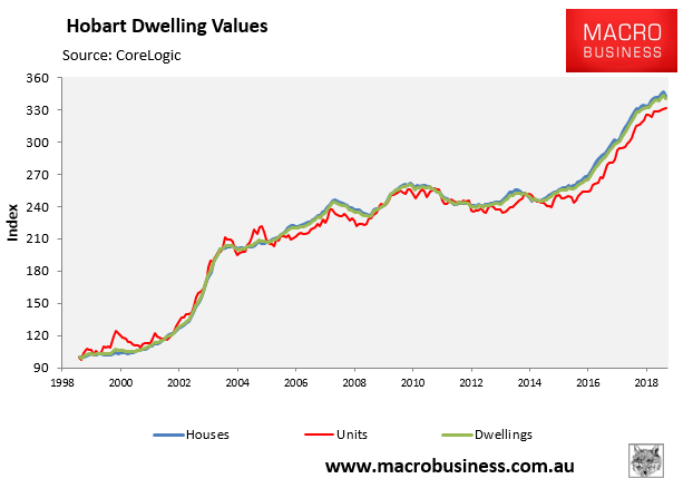 In 2018, Hobart took the mantle of Australia’s last remaining housing bubble, with dwelling prices continuing to surge into the stratosphere: