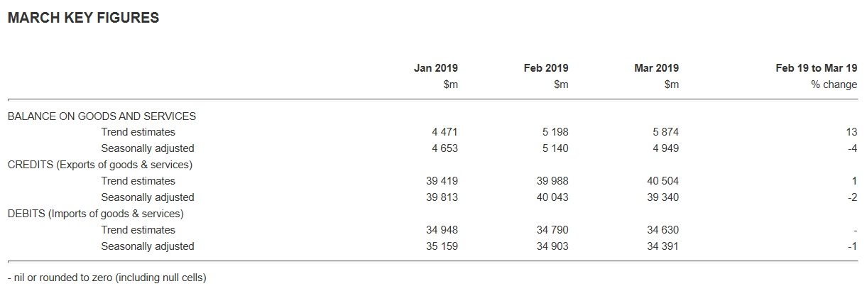 The Australian Bureau of Statistics (ABS) today released trade data for the month of March, with Australia’s trade surplus retracing to $4.9 billion from $5.1 billion in February: