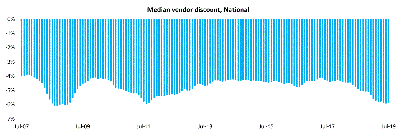 As at July 2019, the median vendor discount nationally, was 5.9% and as the chart shows, discounting has steadied over recent months. At the same time a year ago, discounting levels were recorded at 4.9% and the last time discounts were as large as they are currently was August 2011. The heightened discounting is reflective of the weaker housing conditions over the past year and the increasing level of discount has recently ceased as housing conditions have improved.