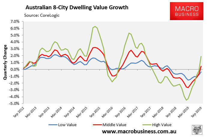 To add more colour, below is CoreLogic data examining price growth across the three broad market segments – bottom 25%, middle 50% and top 25%. This also shows that the most expensive properties have shown the most improvement, and are leading the nascent price recovery.
