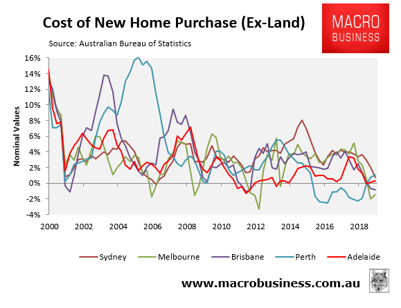 Looking at the five major capitals, you can see that the index is being dragged down by Melbourne and Brisbane, where new home construction costs fell by 1.5% and 0.8% respectively; although growth in Sydney (+0.8%) and Adelaide (+0.3%) is also weak: