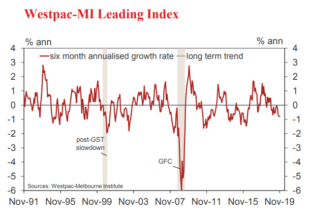 The six month annualised growth rate in the Westpac– Melbourne Institute Leading Index, which indicates the likely pace of economic activity relative to trend three to nine months into the future, fell from –0.78% in October to –0.81% in November.