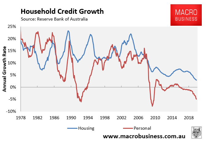 The latest credit data from the Reserve Bank of Australia (RBA) revealed that both personal and mortgage credit growth has tanked, with personal loan growth declining by 4.9% in the year to November 2019 and mortgage growth falling to just 2.9% – the lowest level in recorded history: