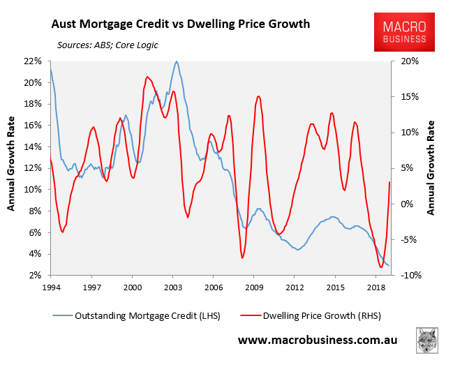 The decline in mortgage credit growth comes at the same time as Australian dwelling values are rocketing, which appears contradictory: