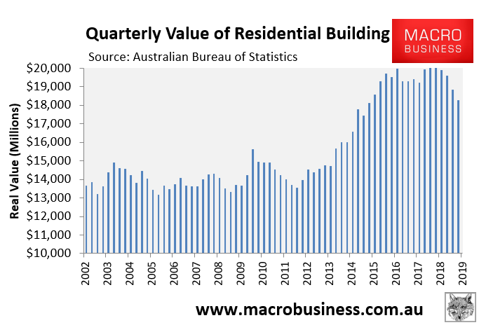 Given the number of dwelling completions are way above approvals and commencements (see first chart), and that approvals and commencements have literally collapsed, this suggests that actual dwelling construction activity will continue falling through 2020, thus continuing last year’s trend: