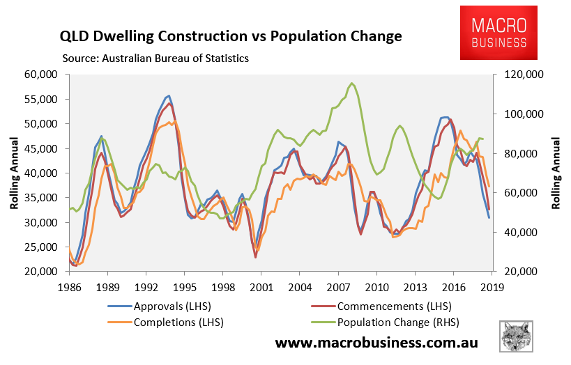 In QLD, the dwelling construction bust is further advanced. Approvals, commencements and completions are each collapsing, whereas population growth into QLD has risen strongly: