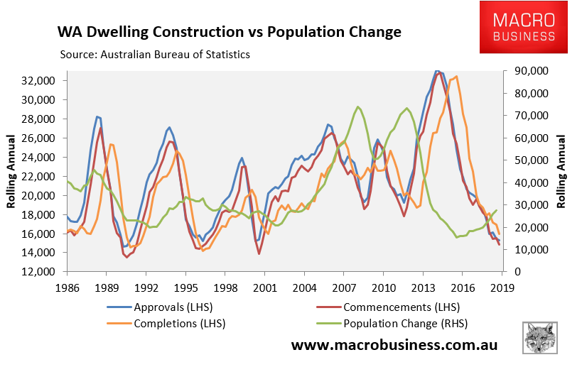 The construction cycle in WA continues to unwind abruptly with approvals, commencements and completions all collapsing. Meanwhile, population growth has rebounded after crashing recently; albeit remains at historically low levels: