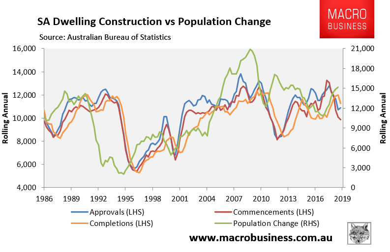 SA’s housing market was headed into oversupply. However, the situation has changed with population growth accelerating just as dwelling construction indicators have fallen: