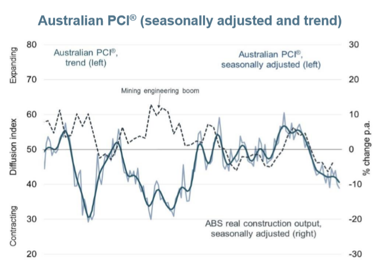 This was the lowest Australian PCI® result since May 2013. Deteriorating indexes for activity, new orders and deliveries from suppliers all indicated a further softening in business conditions across the construction industry.