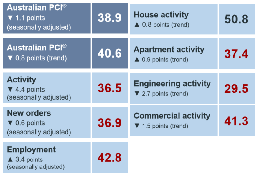 The Australian Industry Group/Housing Industry Association Australian Performance of Construction Index fell a further 1.1 points to 38.9 in December, with deteriorating indices for activity, new orders and supplier deliveries contributing to the lowest Australian PCI® result in six and a half years (readings below 50 indicate contraction in activity, with the distance from 50 indicating the strength of the decrease):
