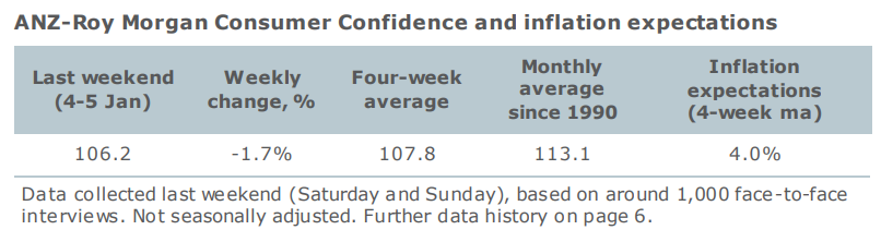 Confidence fell 1.7% last week, to its lowest level in more than four years. A drop in confidence at the start of the year is unusual and almost certainly reflects the impact of the catastrophic bush fires over the weekend.