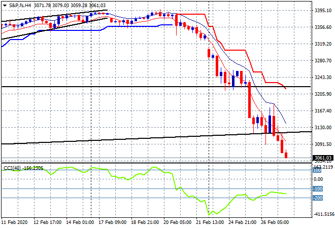 Eurostoxx and S&P futures have sold off sharply this afternoon, both down 2% or more with the four hourly chart of the S&P500 showing no support at all here at the lower trendline from the 2019 rally – looks like the terminus is indeed 3000: