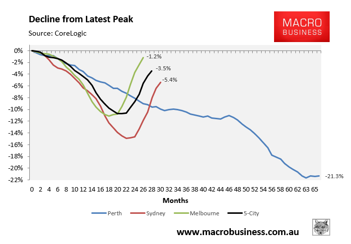 Moreover, while Sydney’s and Melbourne’s housing markets have rebounded strongly, Perth’s has only managed to stabilise.