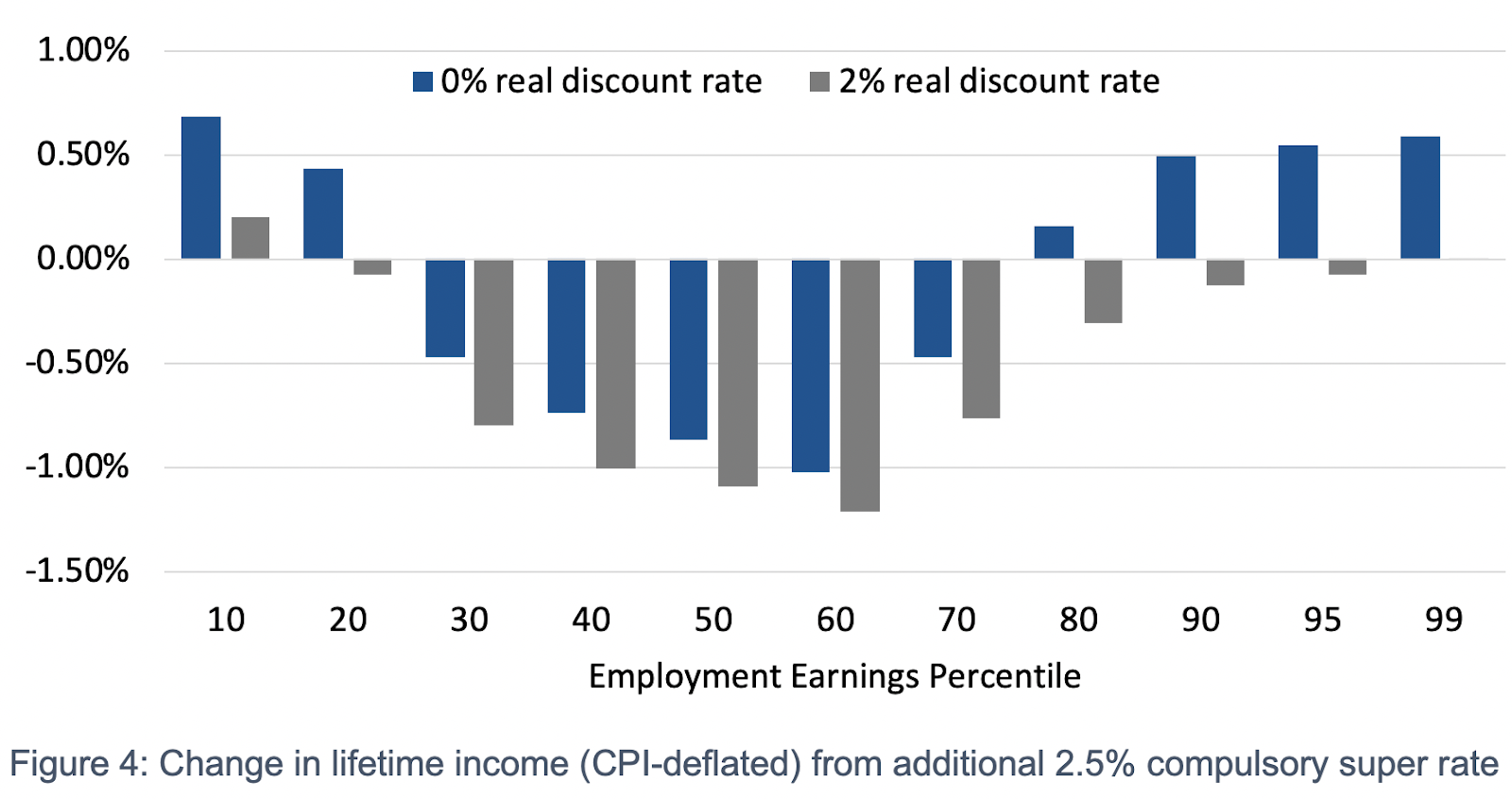 In addition, take-home wages will effectively increase by 9.5% across the board. Rather than going into asset purchase programs in super funds, this income will either be 1) taxed, 2) spend by income earners, or 3) saved and used for asset purchases outside of super. This is a truly massive welfare benefit for the bottom 80% of households who will get a higher lifetime income.