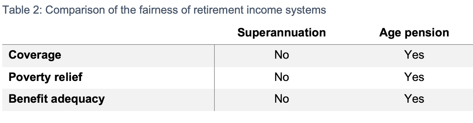 Unlike the age pension, superannuation does not allocate resources to “retirees who do not have the alternative non-work income sources necessary to sustain a socially acceptable level of welfare.”