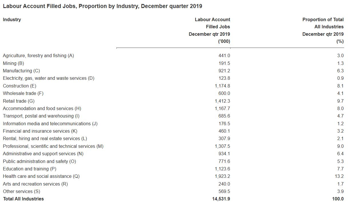 The Australian Bureau of Statistics (ABS) has released its experimental labour market accounts for the December quarter, which reveals that healthcare and social assistance continued to drive jobs growth in calendar year 2019, with the number of jobs in this industry surging 5.3% year-on-year: