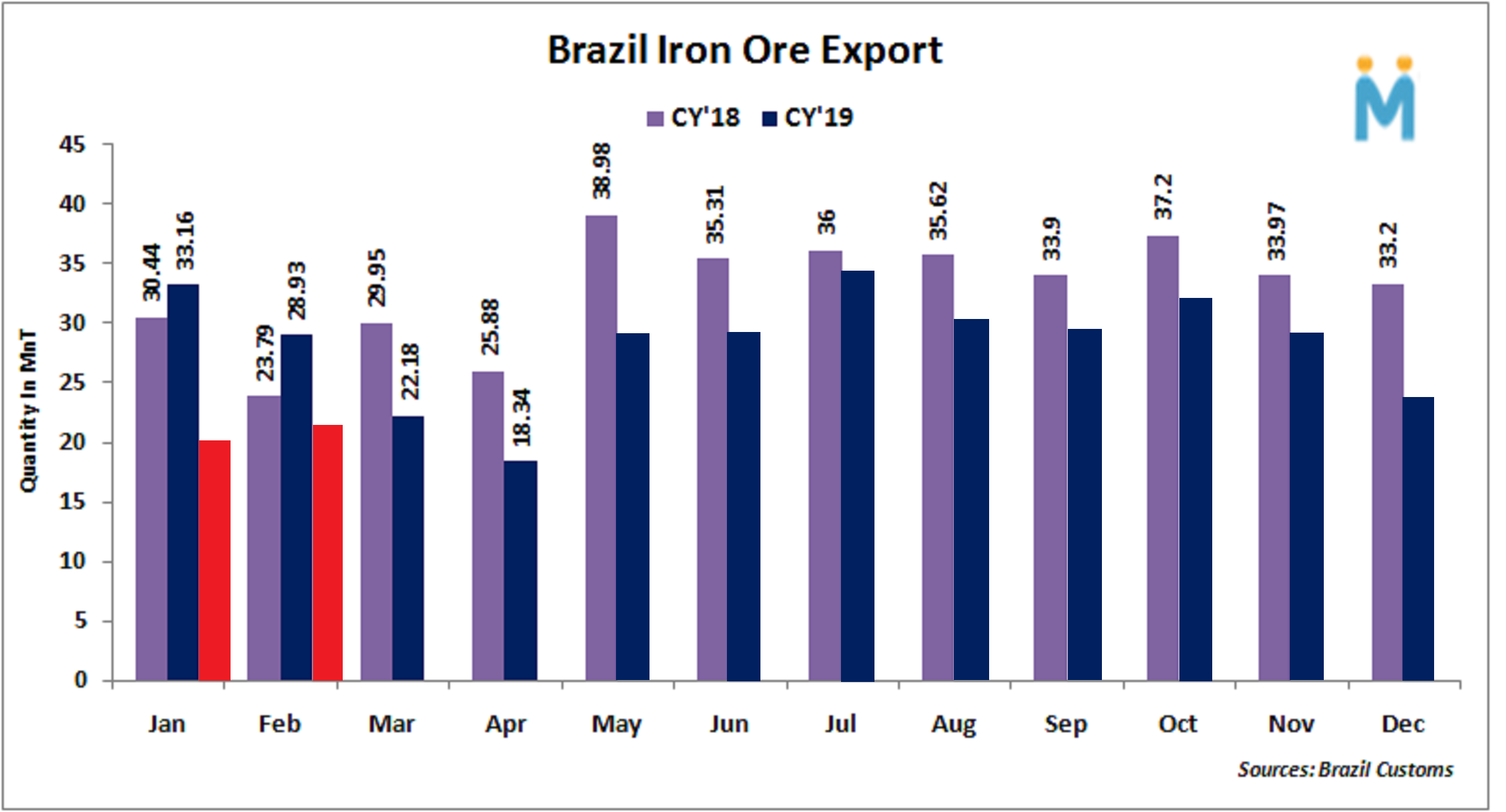 Strong iron ore prices can to some extent be explained by shockingly weak Brazilian exports. The last three months have seen some 120mt of annualised supply offline:
