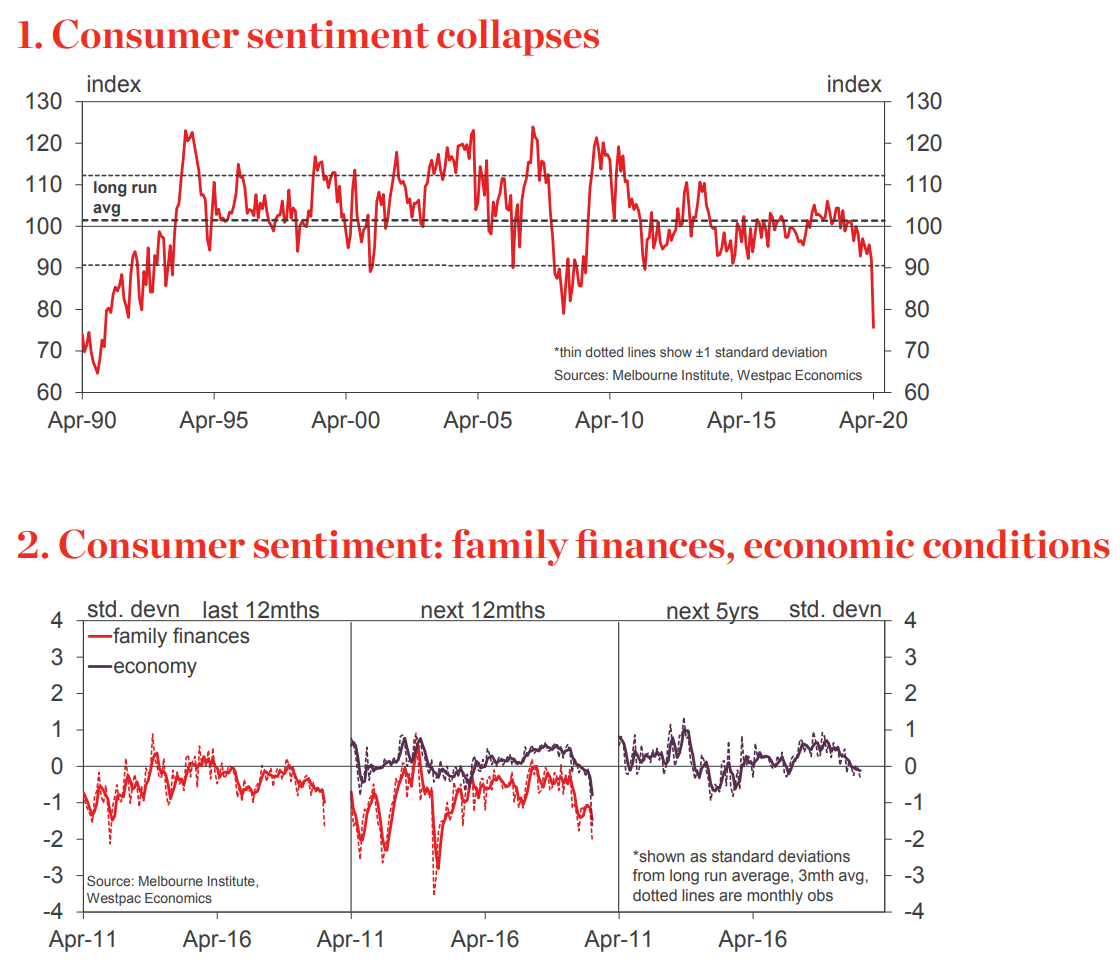 ― The Westpac–Melbourne Institute Consumer Sentiment Index plunged 17.7% to 75.6 in April from 91.9 in March. The fall marks the single biggest monthly decline in the 47yr history of the survey and takes the Index beyond GFC lows to levels only seen during the deep recessions of the early 1990s and early 1980s.