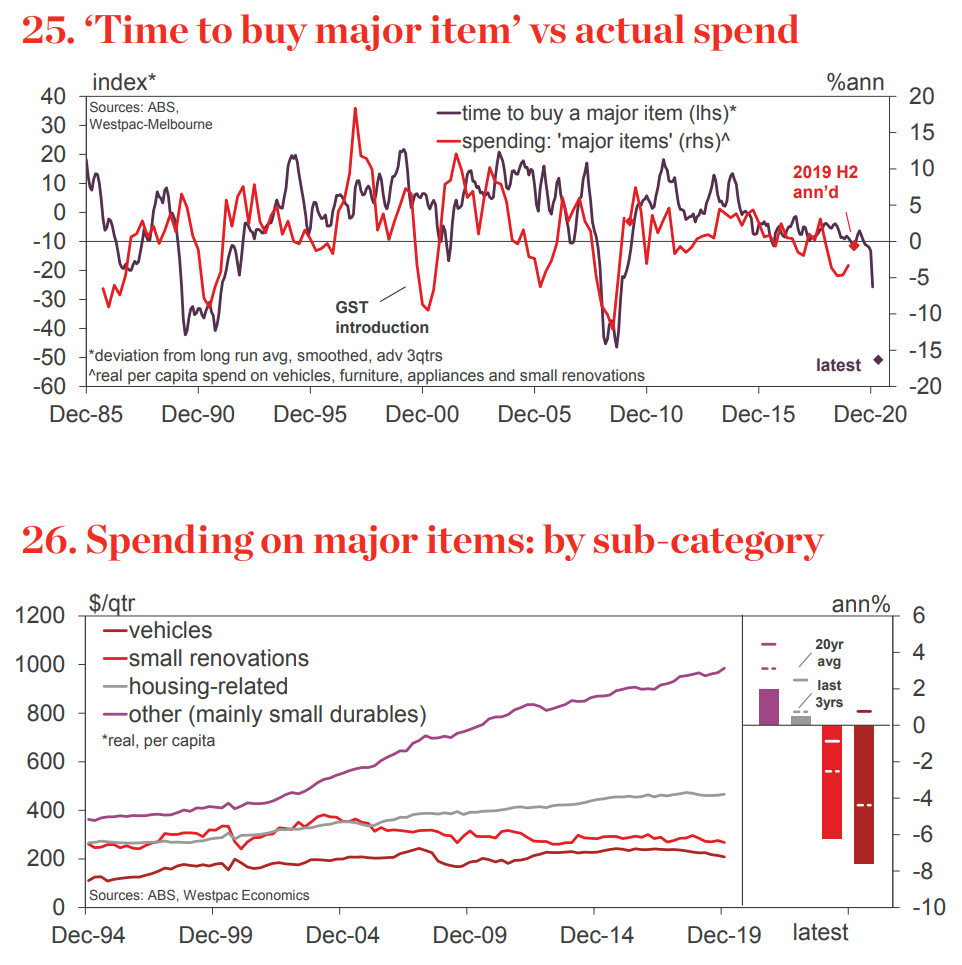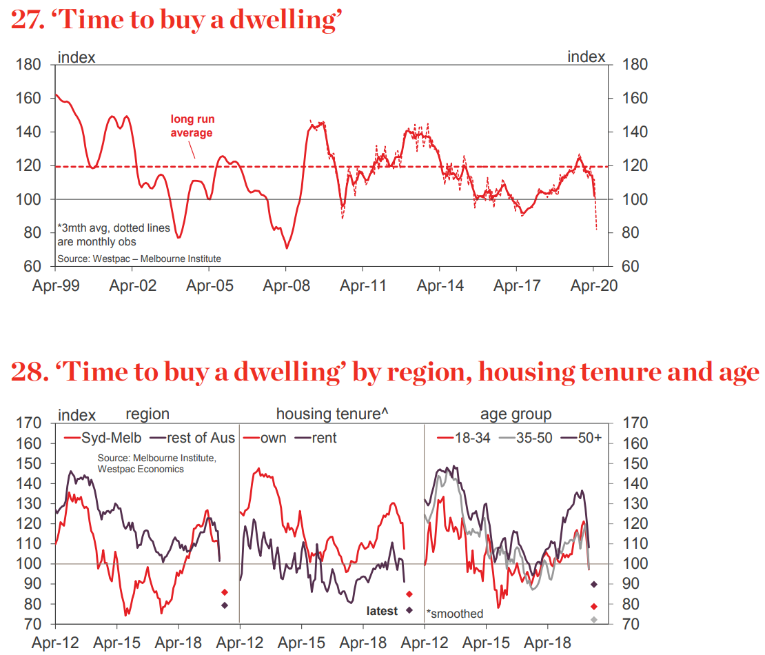 ― Durables spending is set to fall sharply in coming months. The ‘time to buy a major item’ sub-index plunged 31.6% in April – the sharpest fall on record – to 76.2, the lowest reading since the record low of 71 set during the GFC. The drop refl ects multiple factors including: health concerns around being in shopping environments; ‘social distancing’ restrictions; direct pressures on budgets and a reluctance to make ‘big ticket’ purchases.