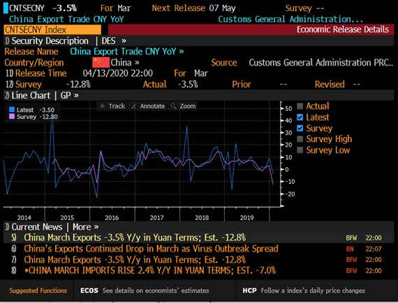 Amid the total closure of the global economy, Chinese exports fell -3.5% and imports lifted 2.4%.