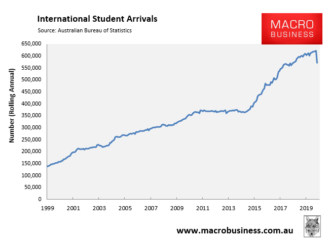 Not surprisingly then, annual international student arrivals fell by 7.9% in February and by 5.7% year-on-year: