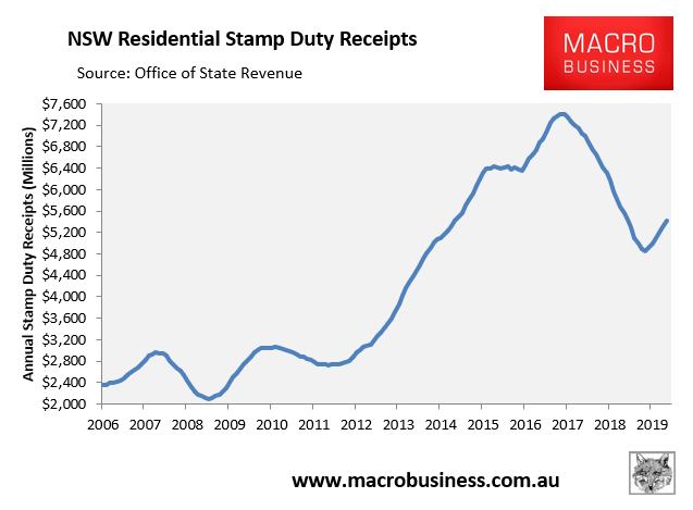 According to data from the NSW Office of State Revenue, annual stamp duty receipts in March had rebounded by $560 million (12%) from their August 2019 low: