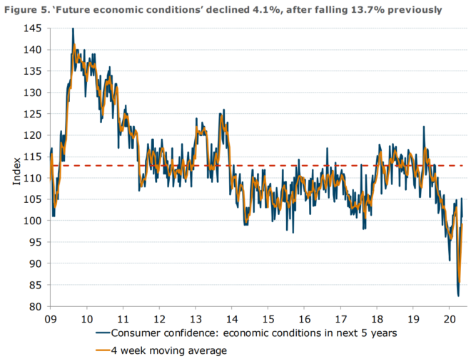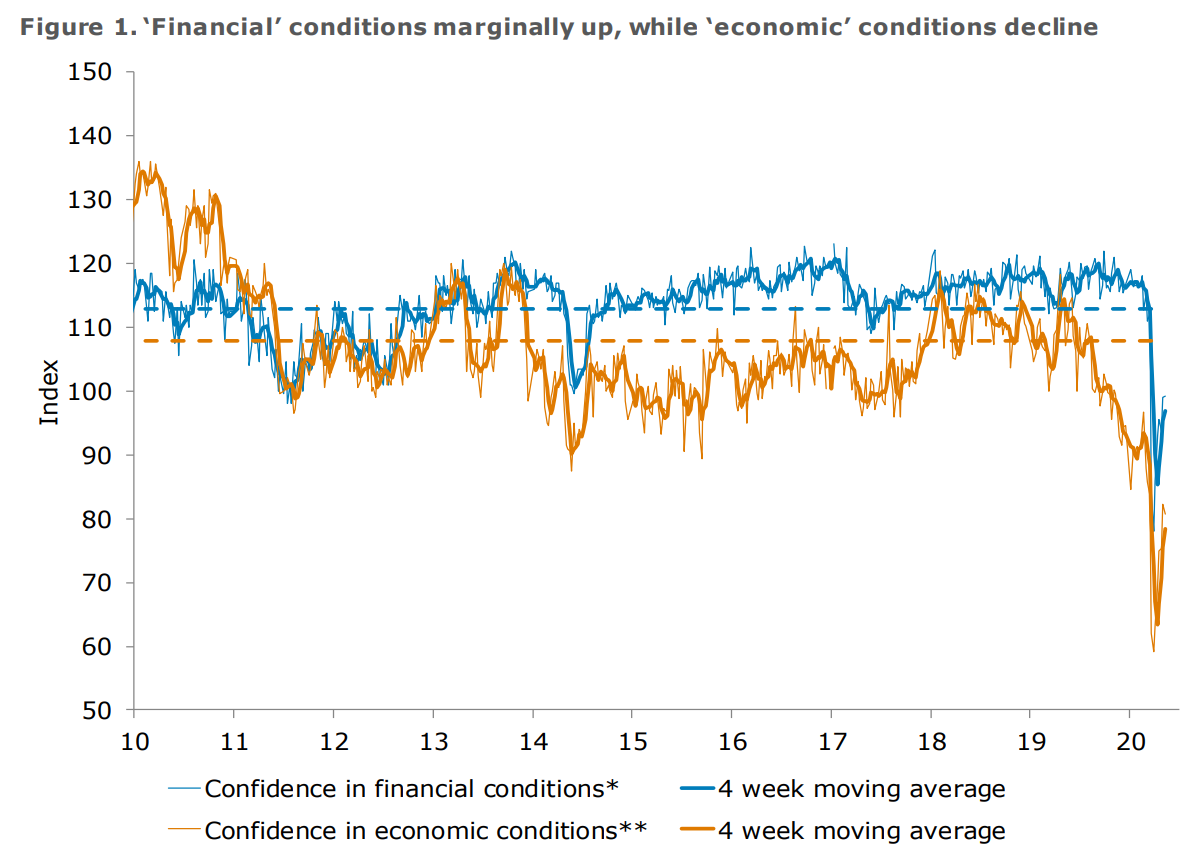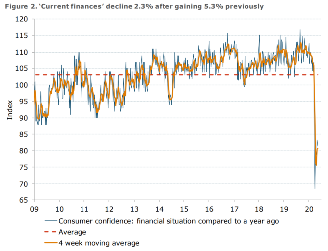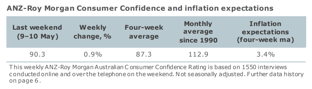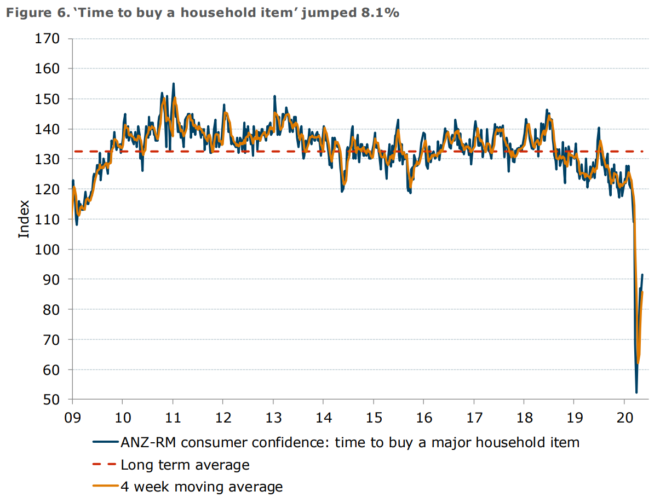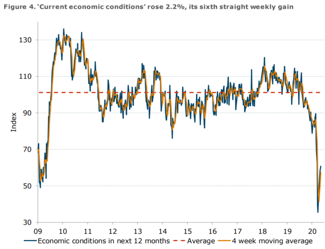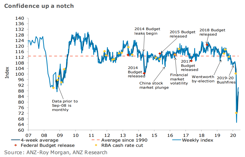 Confidence continued to gain last week, though the pace of increase eased. The recent gains have resulted in the index recovering some 70% of the fall seen in the last two weeks of March. The gain likely reflects the continued good news on the path of the pandemic in Australia and the associated progressive easing of restrictions. The challenge for the coming week will be how households react to what is expected to be dire news on the state of the labour market.