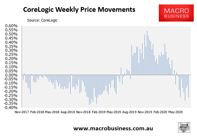In the week ended 16 July 2020, the CoreLogic 5-city daily dwelling price index, which covers the five major capital city markets, fell another 0.27%: