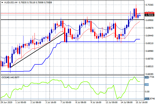 The ASX200 gapped higher at the open and stayed above 6000 points throughout the session, closing some 1.9% higher to 6052 points. SPI futures are up around 20 points, with the daily chart indicating a probable breakout and an echoing of other moves on equity markets as momentum remains clearly positive: